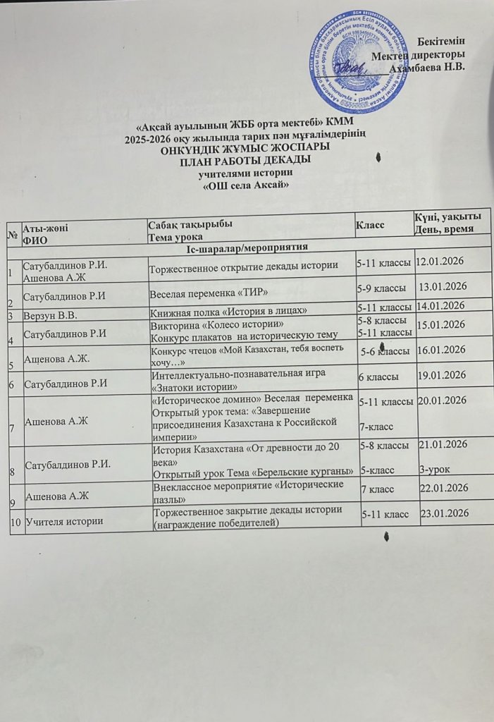 2026 жылғы 12 қаңтарда Ақсай ауылындағы ЖББМ тарих пәні бойынша онкүндіктің салтанатты ашылуы өтті. Іс-шара мерекелік және танымдық атмосферада өтті және қазақ халқының тарихы мен мәдениетін құрметтеуге тәрбиелеуге бағытталған. Ашылу барысында оқушылар хандар, билер мен батырлардың қатысуымен шағын көріністер ұсынды, онда халықтың маңызды тарихи оқиғалары, салт-дәстүрлері мен құндылықтары көрсетілді. Кейіпкерлердің бейнелері жарқын және мәнерлі түрде жеткізілді, бұл көрермендерге өткеннің рухын және тарихи мұраның маңыздылығын тереңірек сезінуге мүмкіндік берді. Іс-шара оқушылар мен мұғалімдердің қызығушылығын тудырды, ой-өрісінің кеңеюіне ықпал етті және онкүндіктің лайықты бастауы болды.
